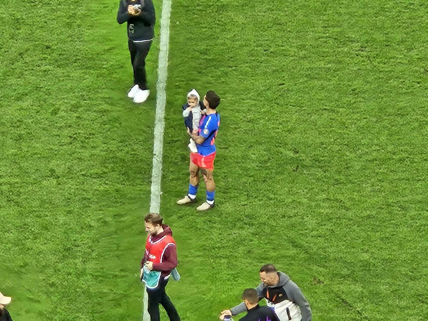 Pe teren a rămas însă Alex Băluță, care s-a bucurat de prezența copiilor săi pe gazon. Cei mici au mers chiar și spre zona Peluzei Nord, înainte de a părăsi terenul alături de jucătorul roș-albaștrilor.